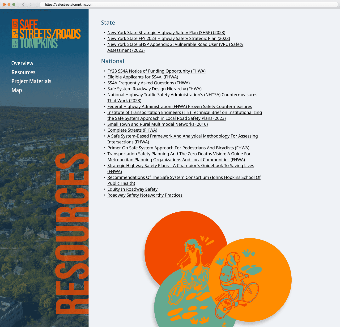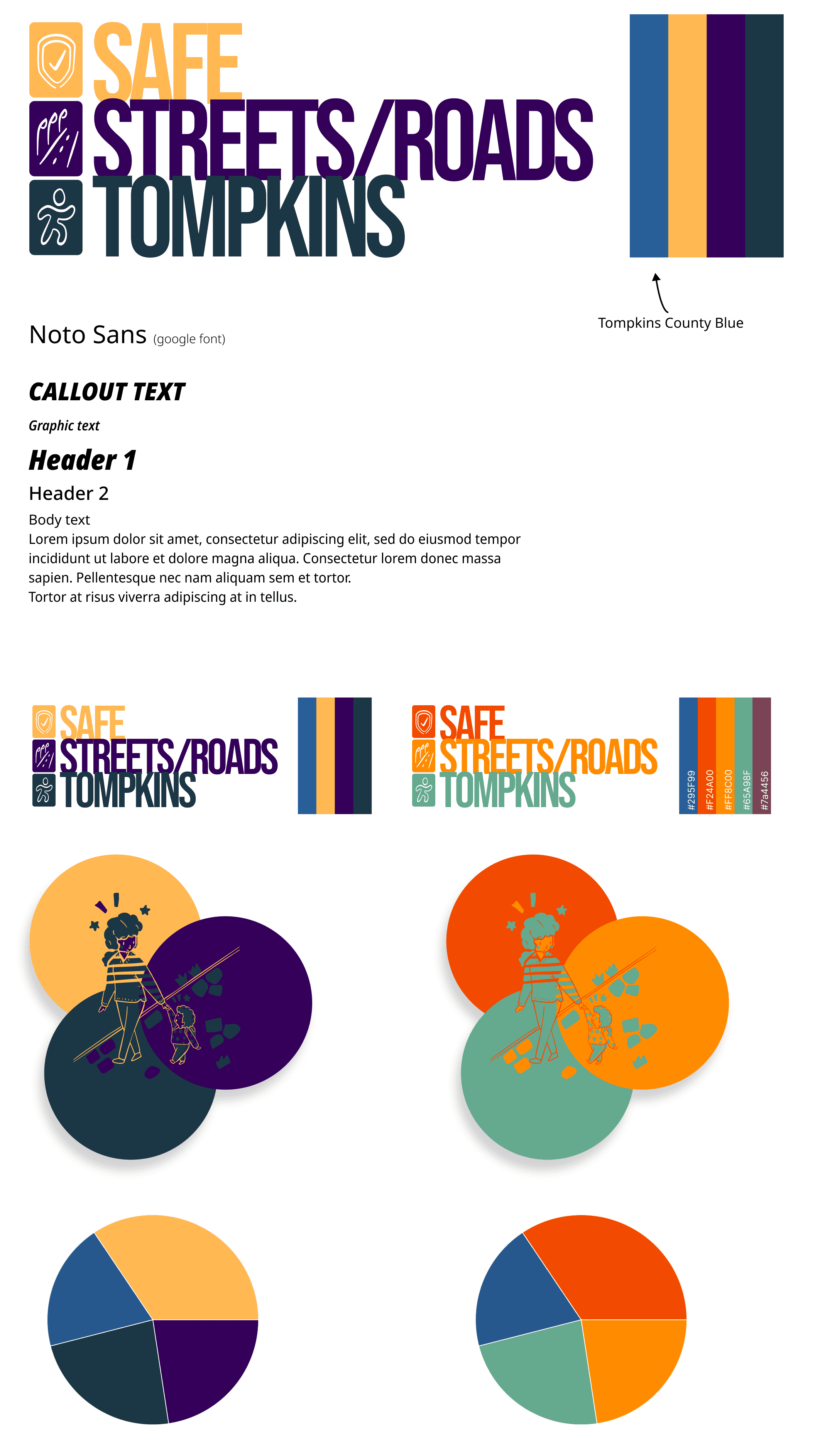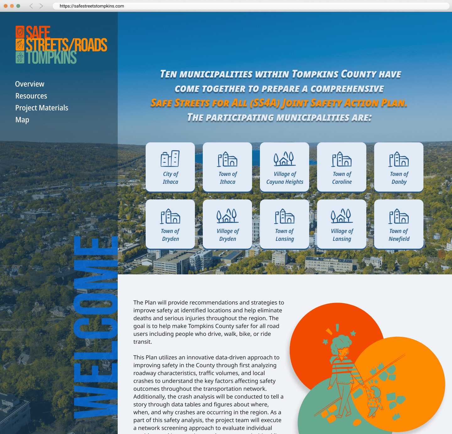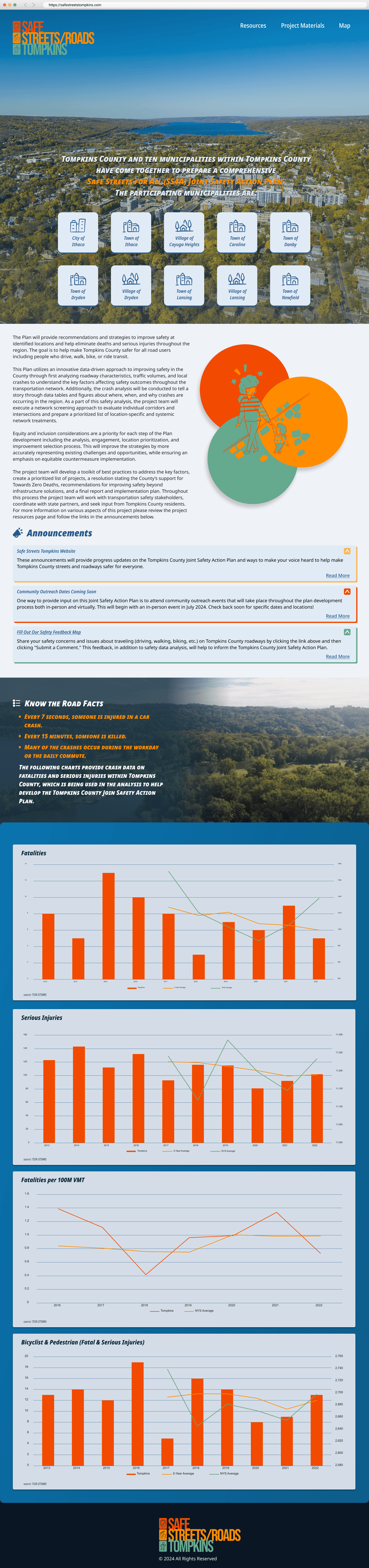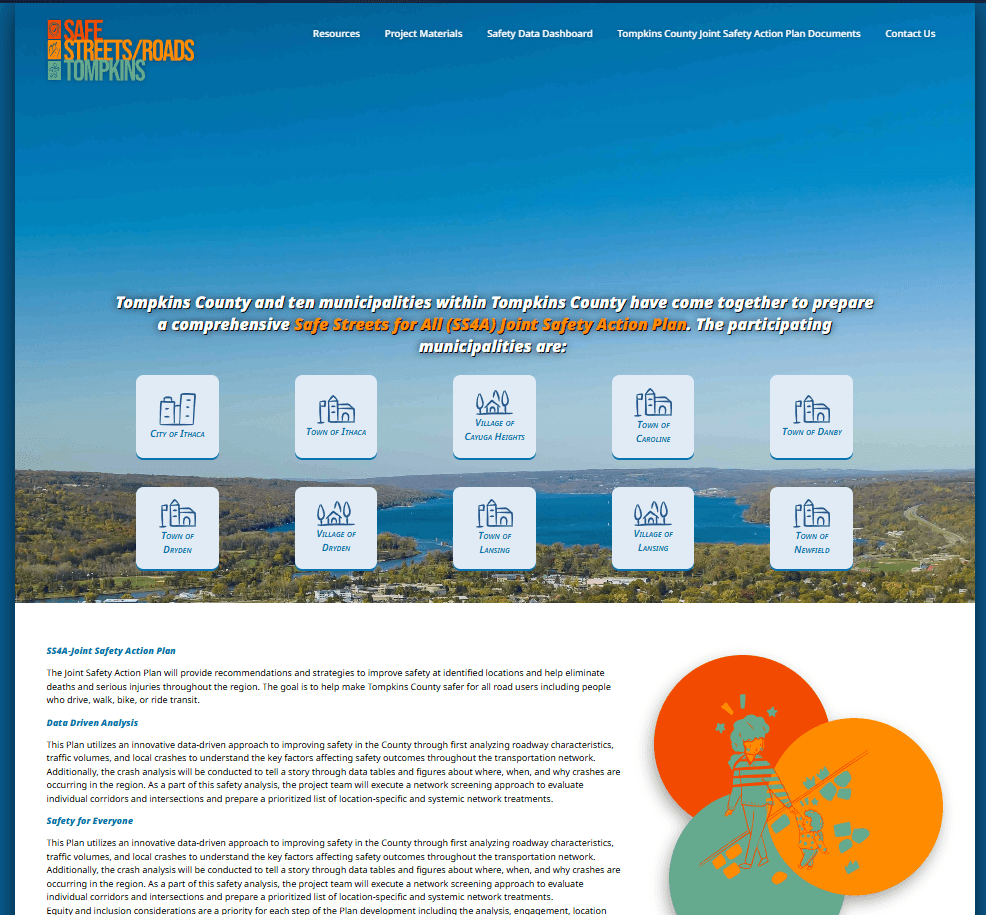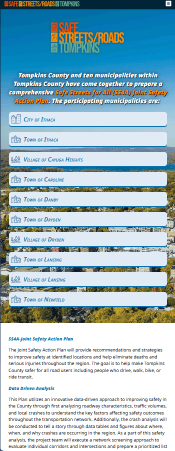 The client requested that we develop a new set of branding guidelines not only for the website, but for the entire SS4A Joint Safety Action Plan. Tompkins County did not have any initial requests for specifications so we had full liberty to develop the initial branding. A series of color palettes, graphics, and logos were developed that would not only be used for the website, but also for the full-length report that it complimented.