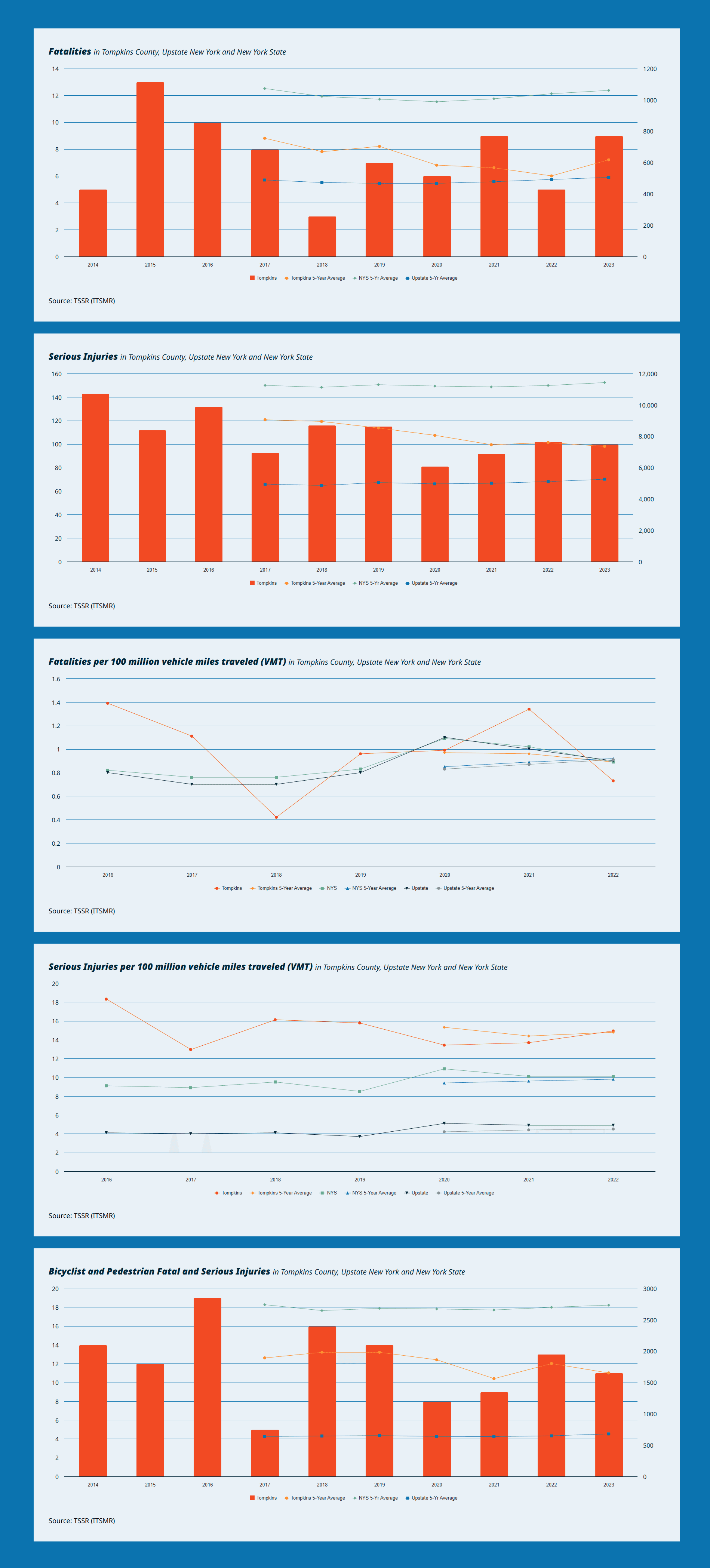 The client requested a dashboard to illustrate the declining rate of motor vehicle fatalities and serious injuries in Tompkins County over recent years. To highlight these trends and enable meaningful comparison against Upstate New York, New York State, and national averages, I developed a set of line and bar combination charts using Highcharts.js. Highcharts was selected over our usual Chart.js framework due to its enhanced feature set, greater interactivity, and advanced configuration options, while still providing the same customizability and maintaining strong cross-platform accessibility.